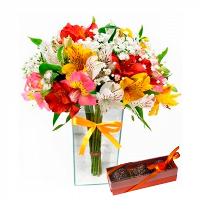 Vaso Poesia em Cores e Trio de Brigadeiros, elaborado no vaso triangular em vidro cristal, confeccionado com 12 hastes com diversas flores de Alstromérias Coloridas e Chuva de Prata. Acompanha Trio de Brigadeiros.
