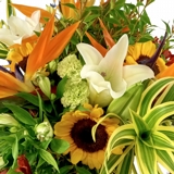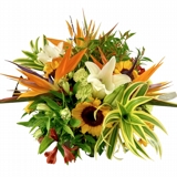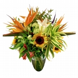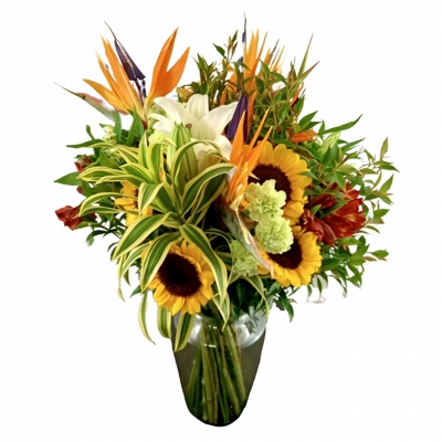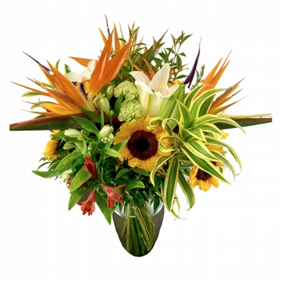 Arranjo Flores Jacarepaguá, vaso de vidro da Cristaleira Imperial elaborado com mix de flores nobres e exuberantes.